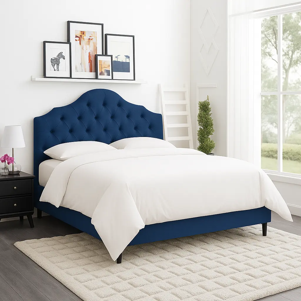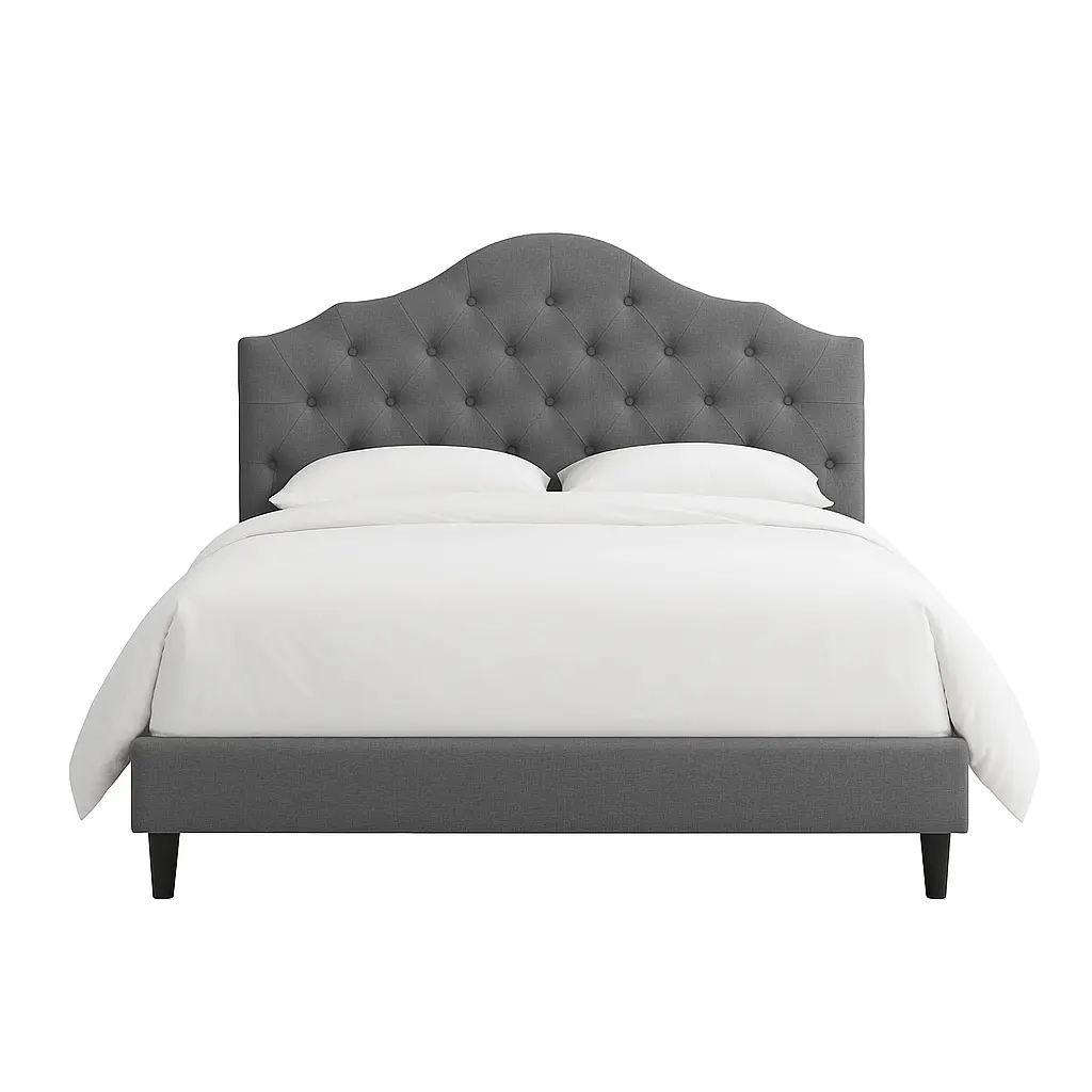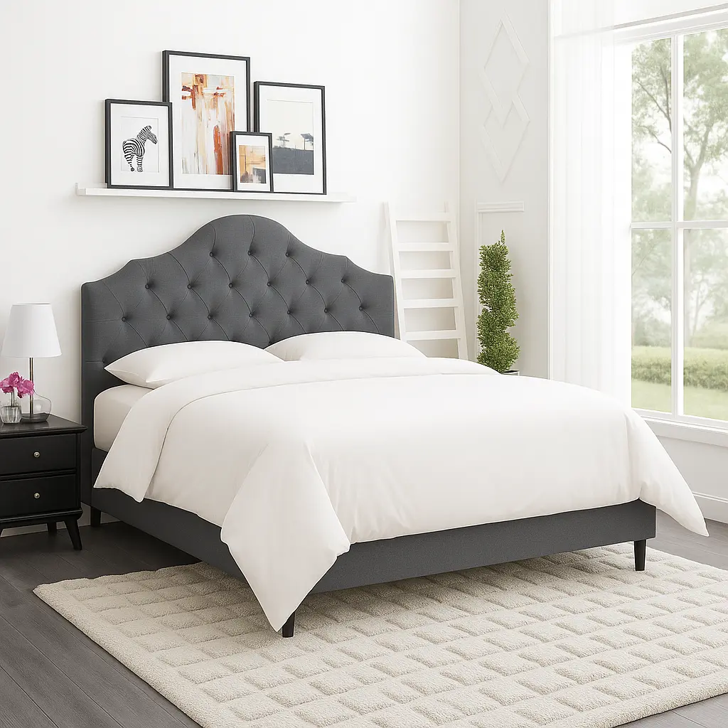 Elegant design by Asghar Furniture. Inspire sweet dreams with a cozy tufted bed. Designed with chic elegance and classic style, Amira comes with a soft Linen fabric upholstered base, timeless button-tufted headboard, and wood bed frame and legs, with non-marking foot caps. Complete with a reinforced center beam for maximum stability.