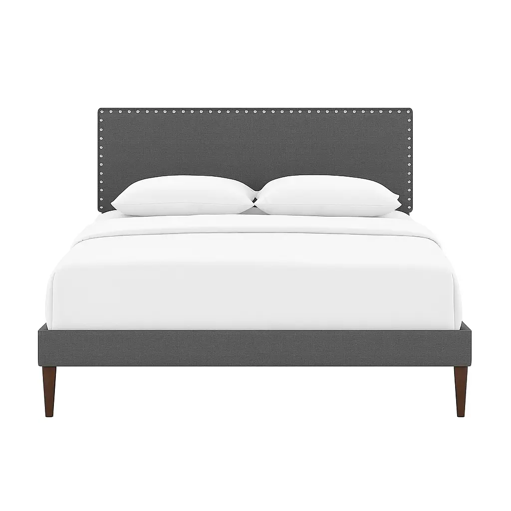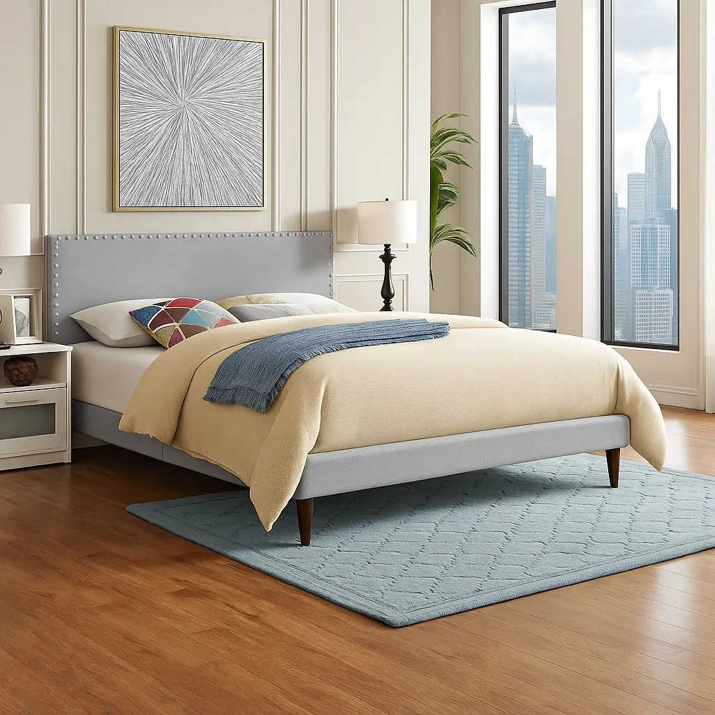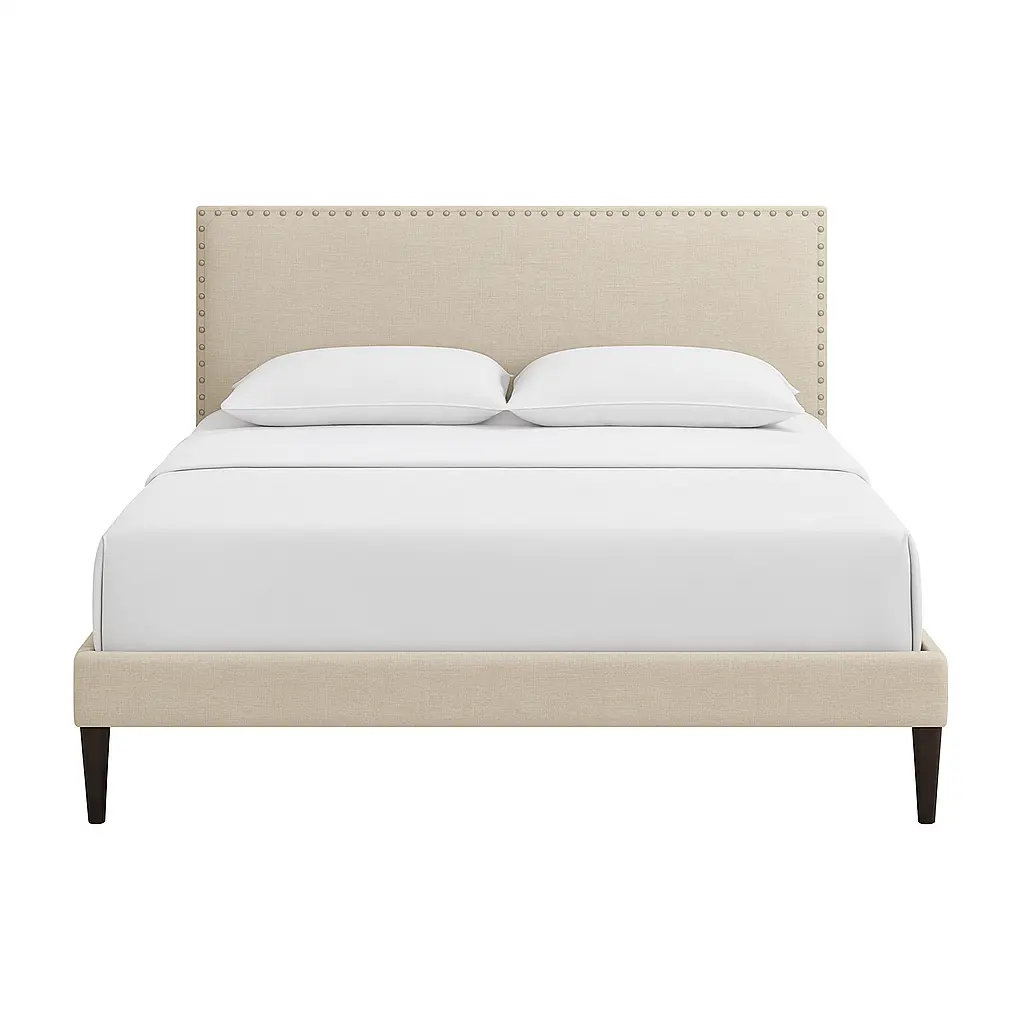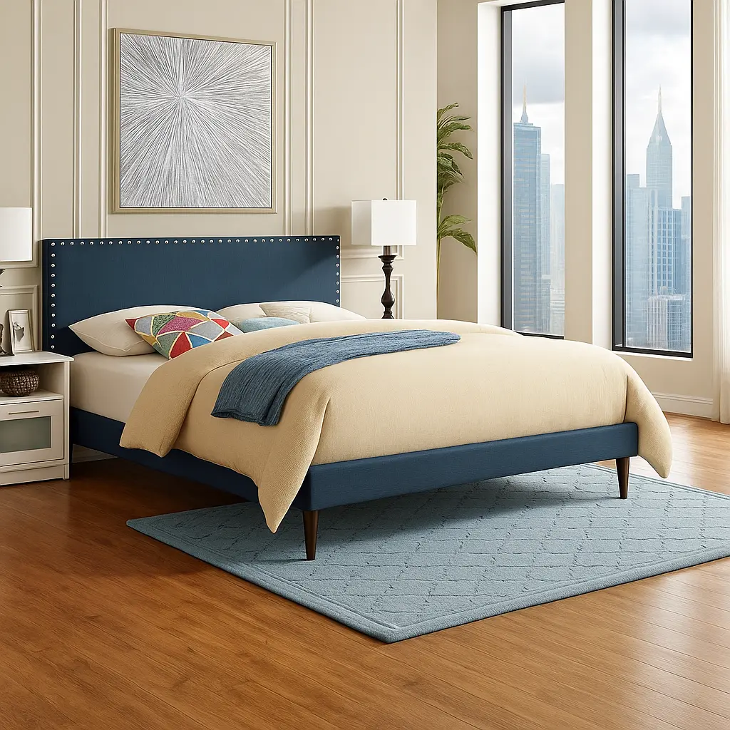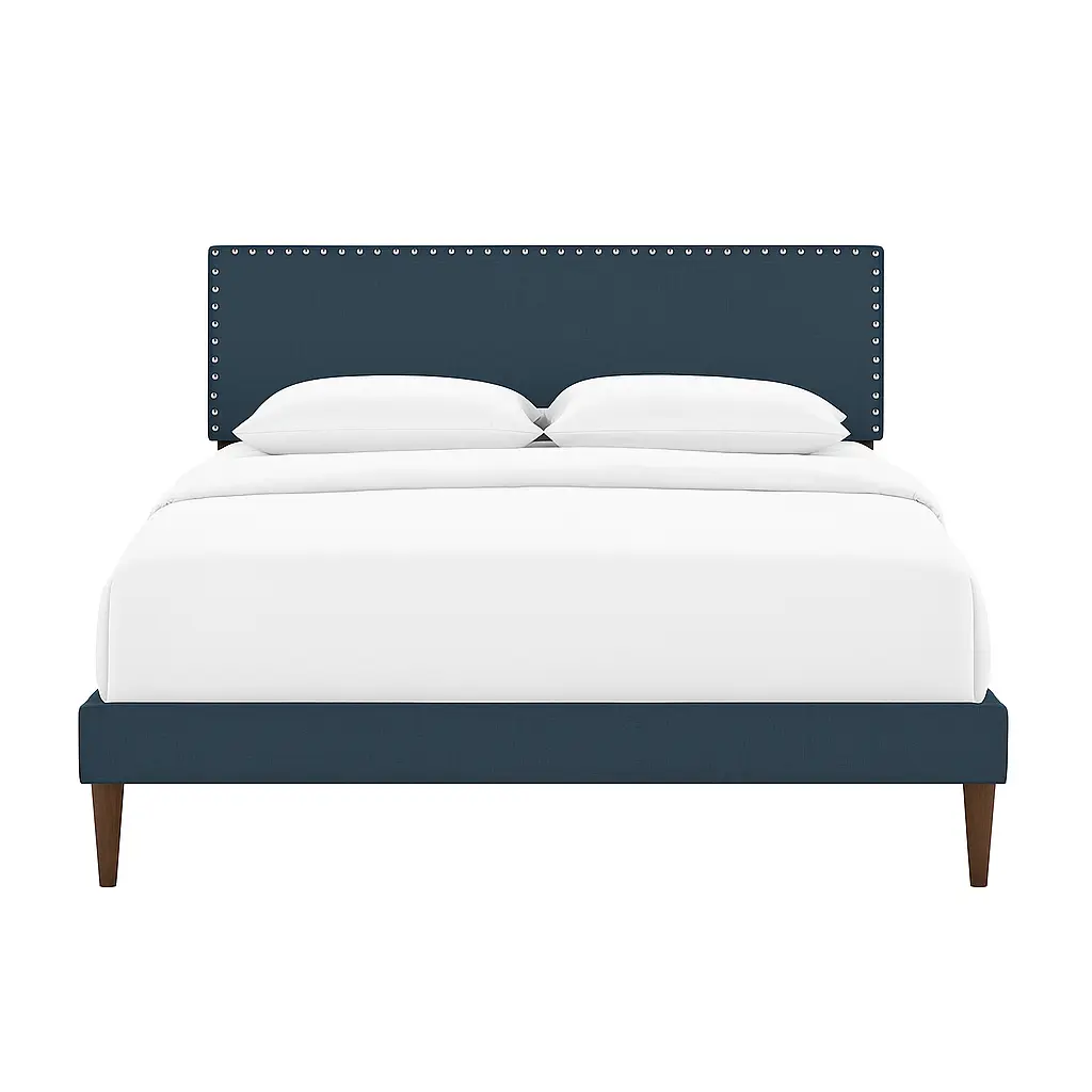 Azure Platform Bed: Strong with a nod to nautical themes, this bed features a handsome nailhead trim and sturdy, dark brown legs. The breathtaking design is built to be the perfect showcase in any bedroom, regardless of style.