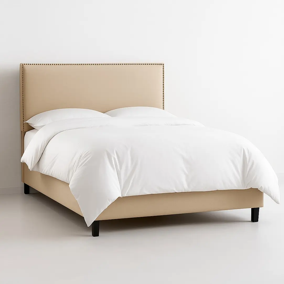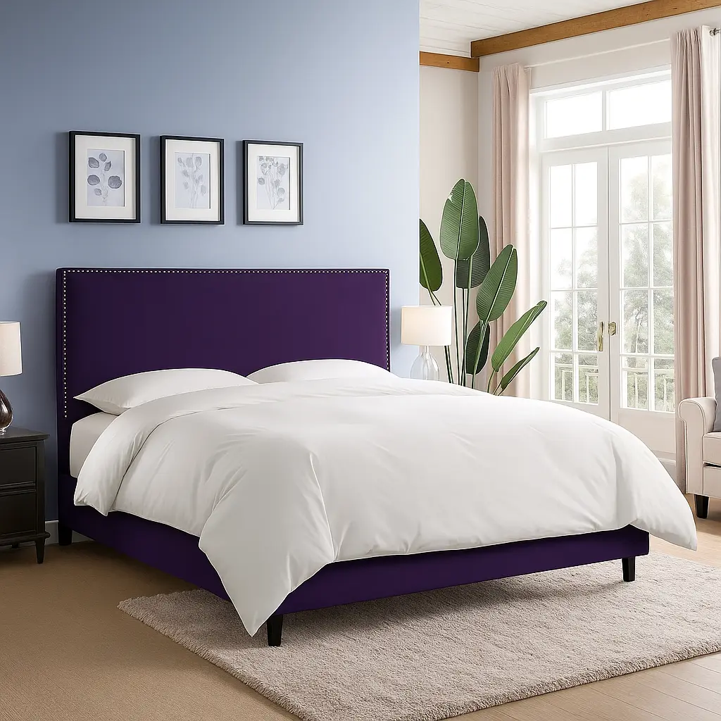 At Asghar Furniture, Create a sleek and sophisticated look for your bedroom with Blush Velvet Bed nail button border bed. Upholstered in soft velvet, the headboard is highlighted with a row of decorative nail buttons outlining the silhouette. The frame is constructed with plush foam padding for added comfort.