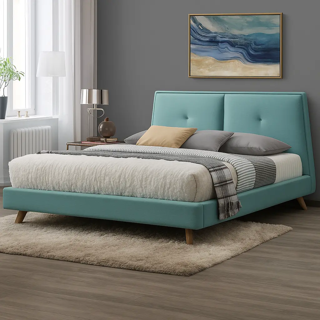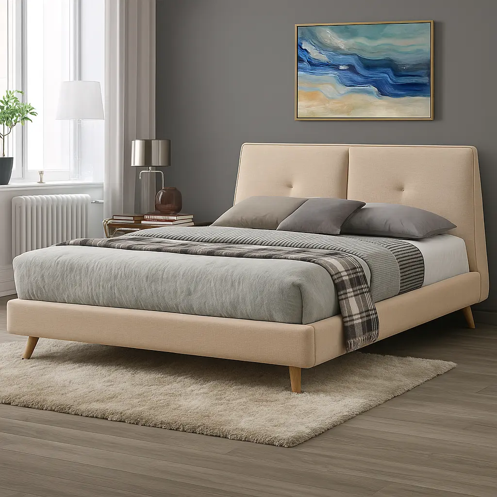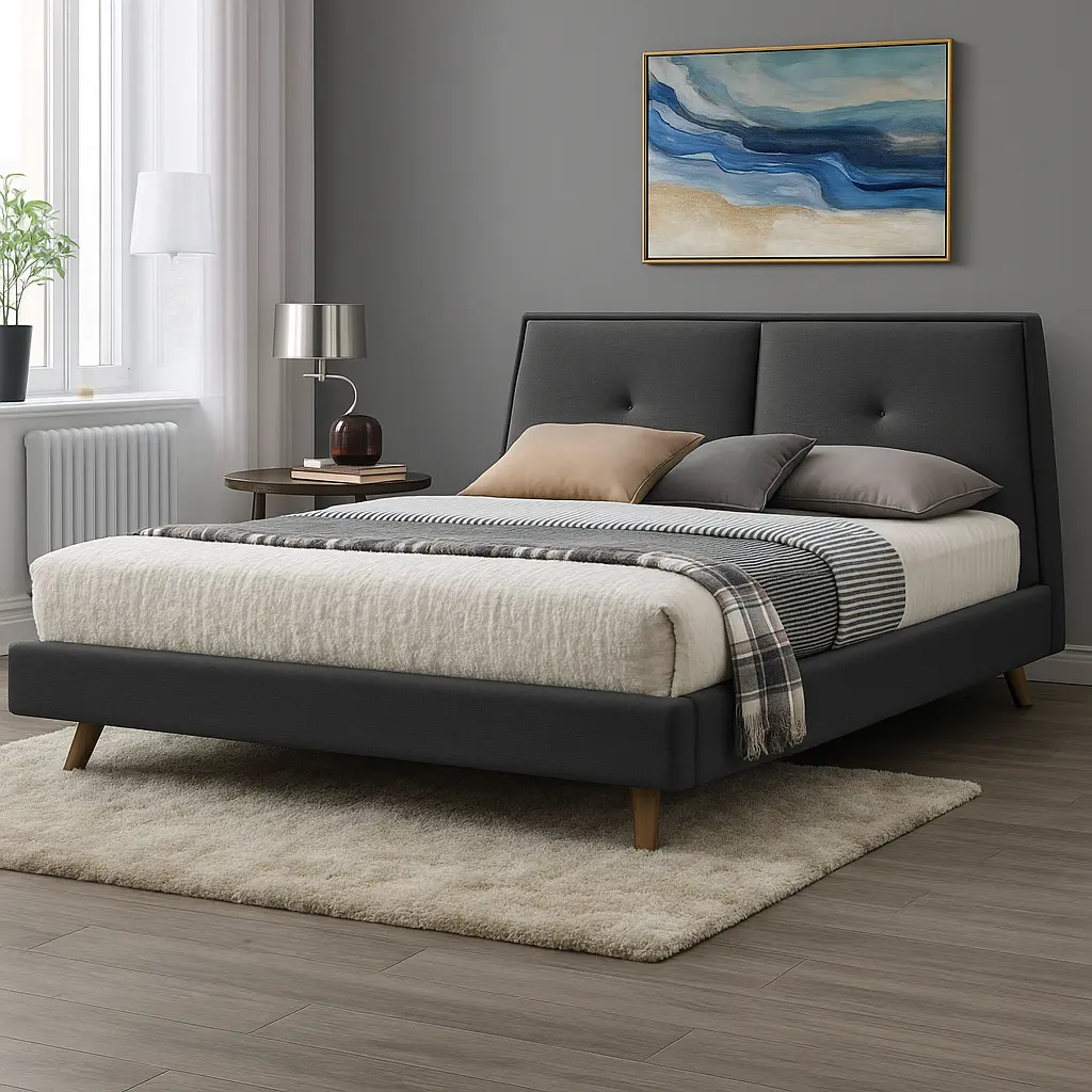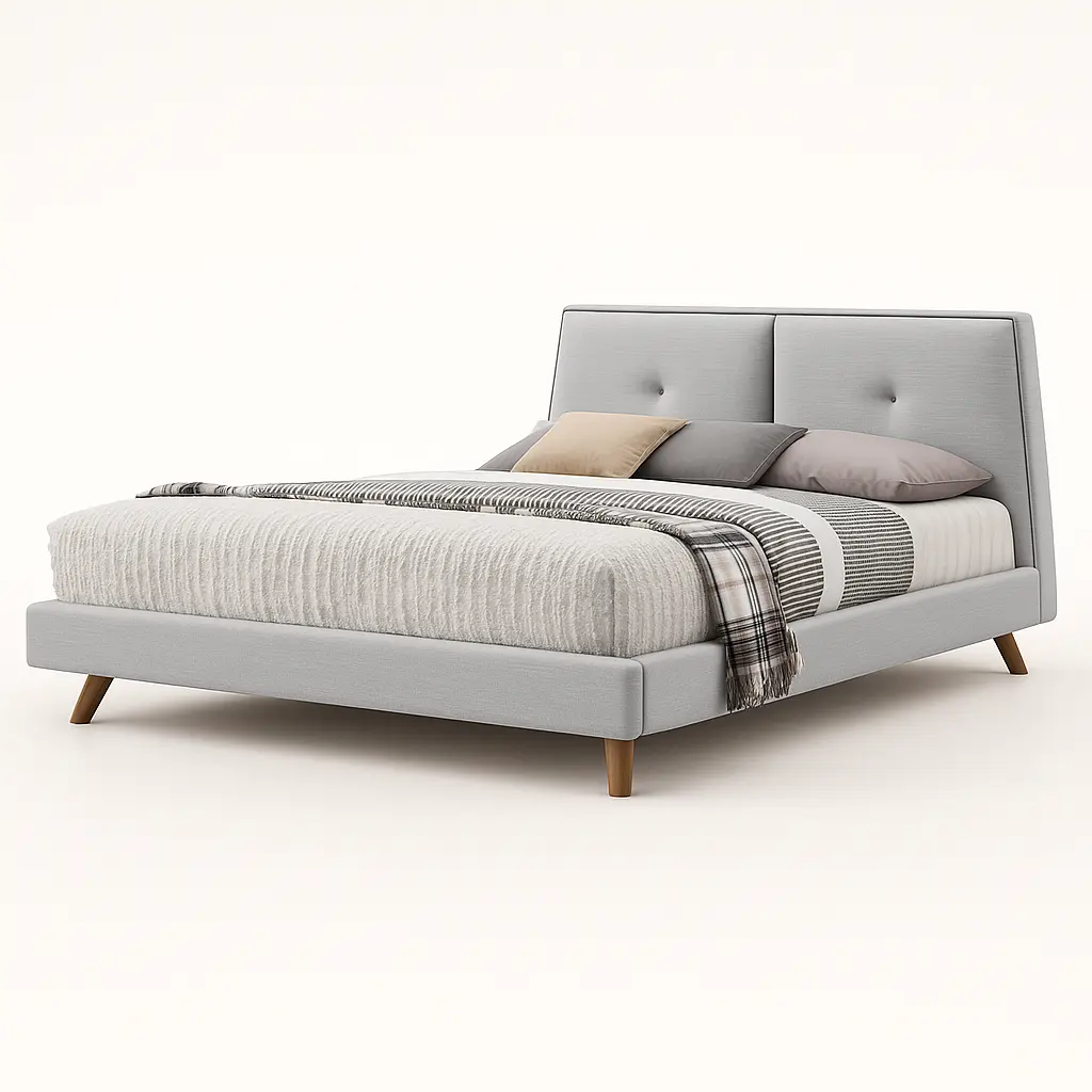 - Trapezoid-shaped headboard with button tufting