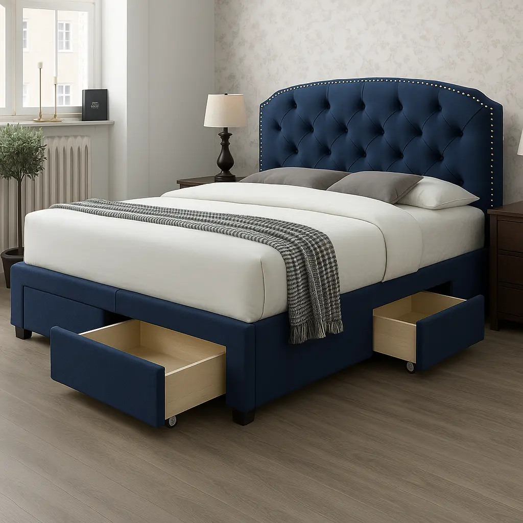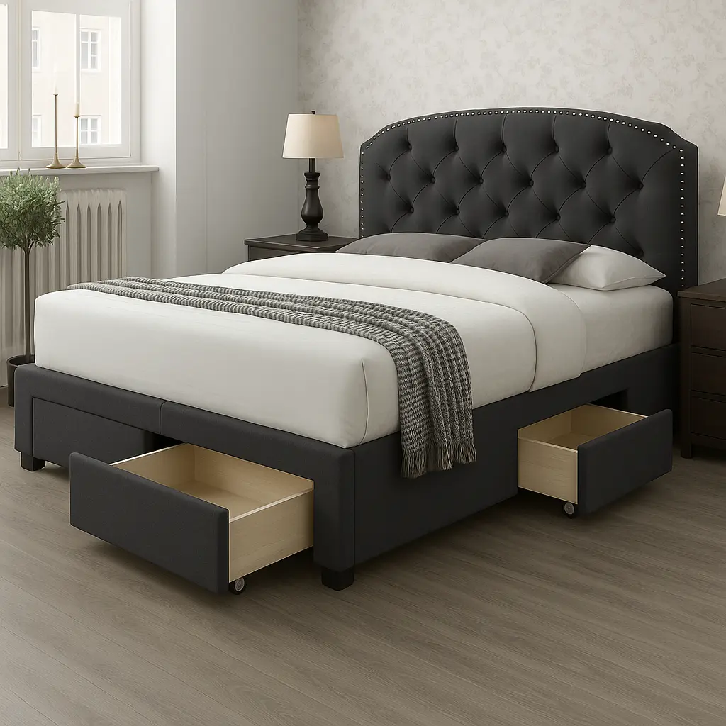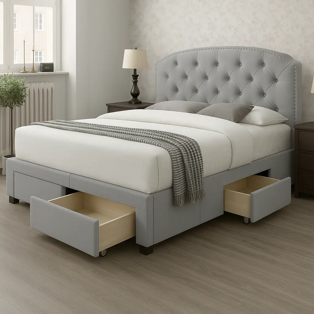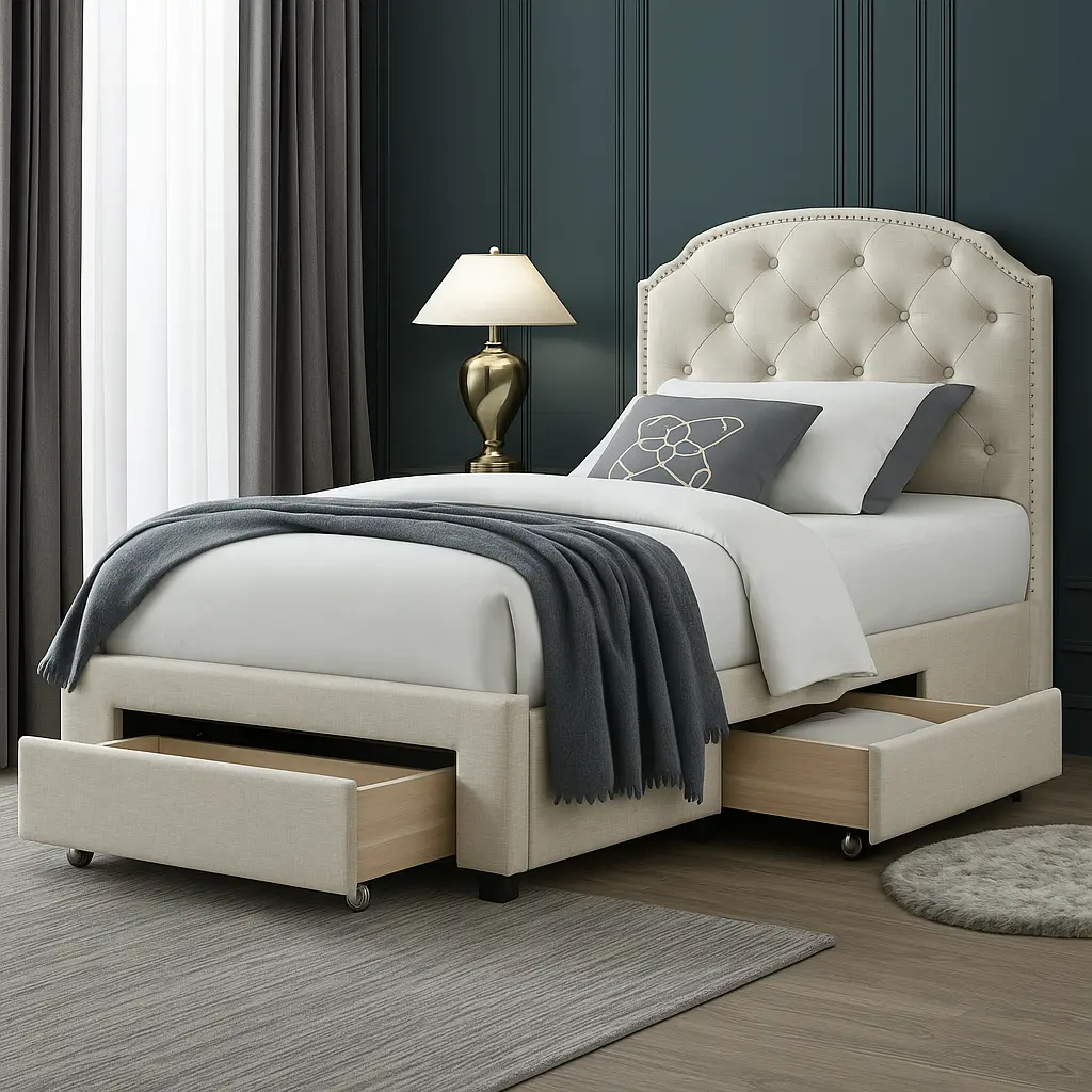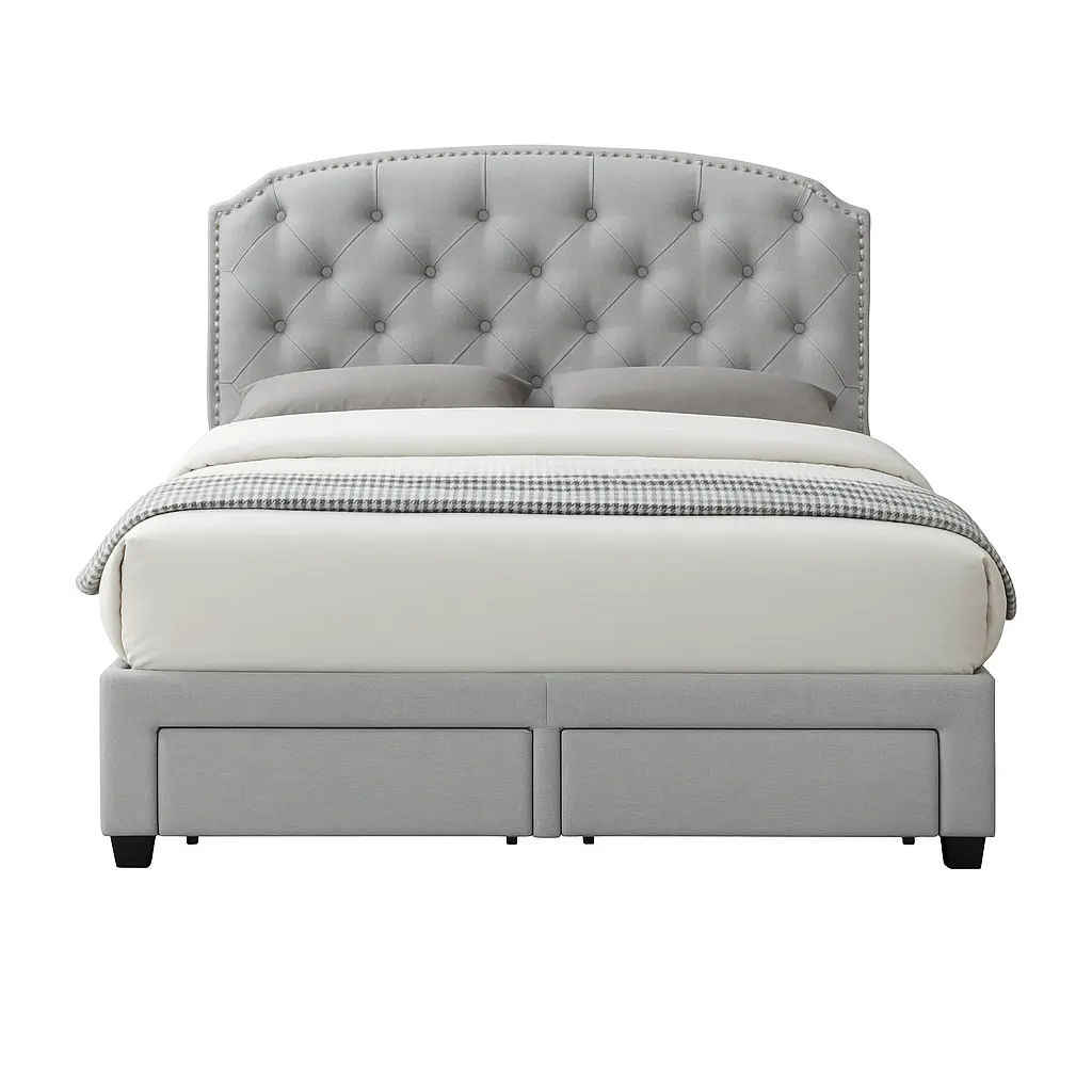This Deluxe Storage Bed flaunts a curved headboard and a storage base. Padded and upholstered in your choice of a grey or beige fabric, its nickel nailhead trim and button-tufted headboard