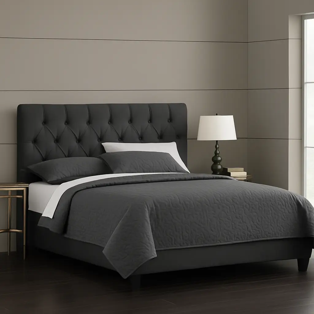 Ideal for any bedroom style, this Tufted Grey Velvet Bed is just what you’re looking for. Upholstered in luxurious velvet. Fill your bedroom with this stunning shade of velvet for a more stylish look and restful sleep. Accented with tufting, this bed has ultimate style that will update your space. Luxurious, comfortable and fashionable, this elegant bed has plush foam padding that plush foam padding to give you the comfort you are looking for.