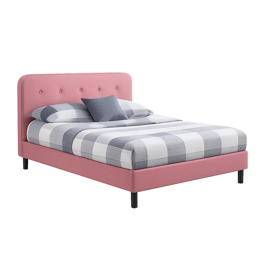 At Asghar Furniture, The beautiful Margot Upholstered Bed button-tufted headboard with a low profile footboard style frame, and wood slats and exposed feet for support.