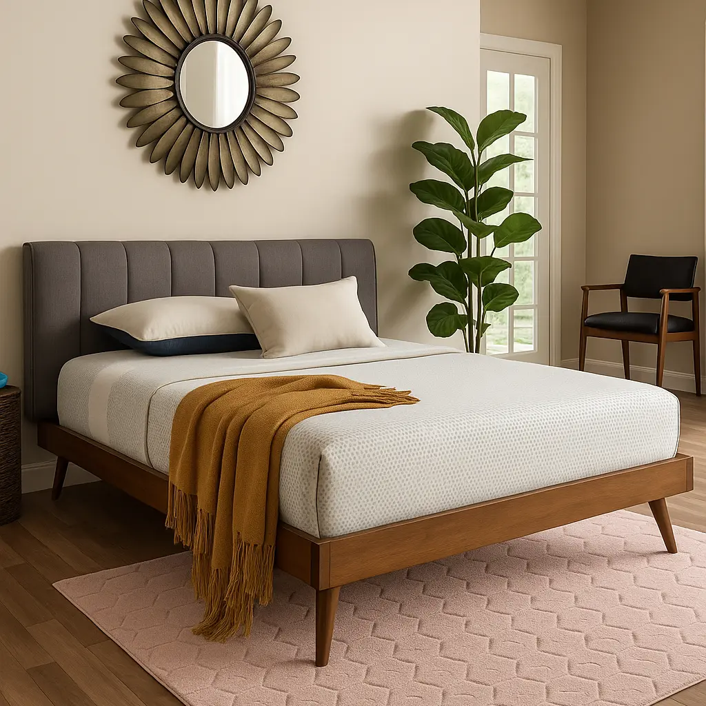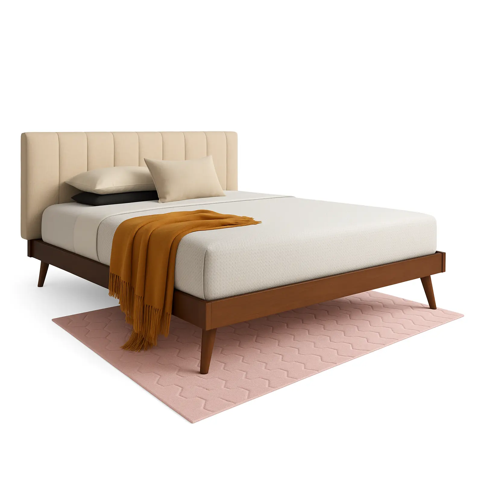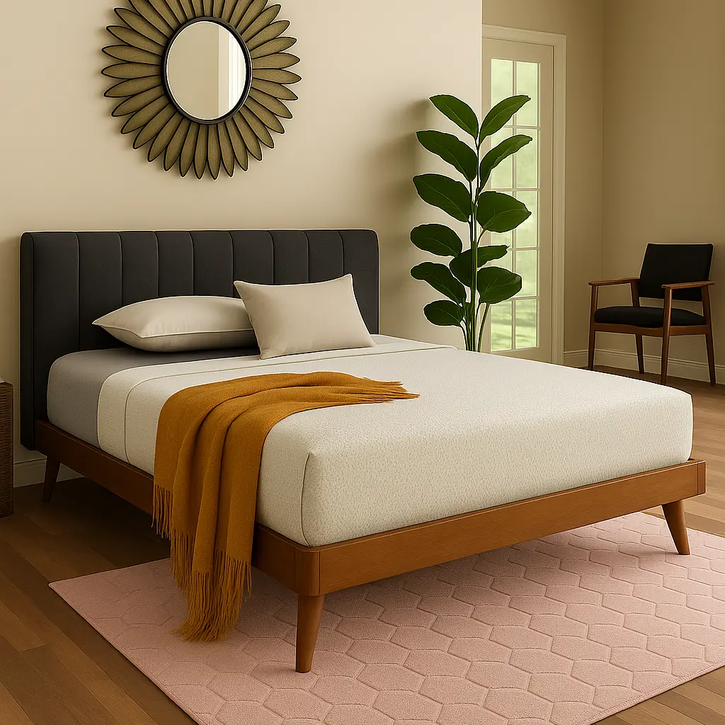 With its clean lines and low profile, this Mid Century Modern Fabric Bed adds cool retro style to your bedroom. Inspired by mid-century modern design, this wood bed is built with a low platform set on top of angled legs. The warm walnut brown-finished wood frame is paired with a soft, chic fabric upholstered headboard that provides a comfortable spot to lean against