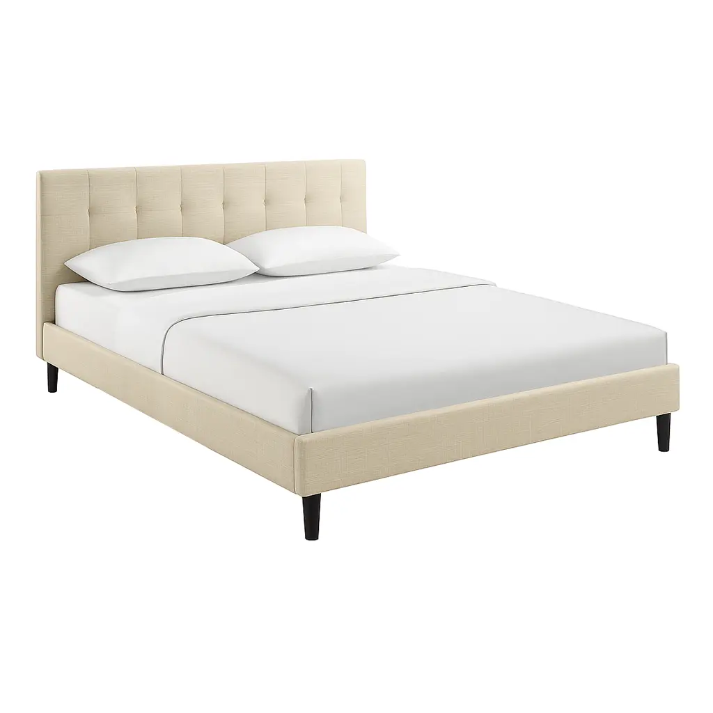 At Asghar Furniture, Riley Upholstered Bed boasts an upholstered polyester fabric base and tufted headboard, solid wooden legs, and a slatted wood support system which eliminates the need for a box spring.