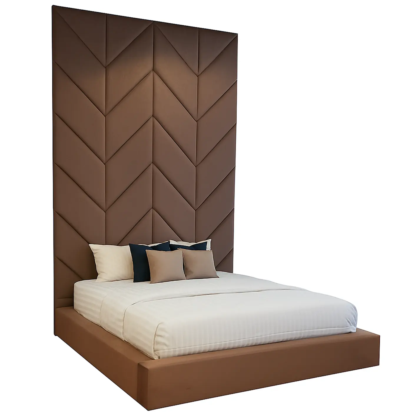 Transform your bedroom into a refined sanctuary with the Chevron Luxe Panel Headboard. Featuring an eye-catching chevron pattern crafted from soft, padded panels, this statement piece extends nearly to the ceiling, creating an illusion of spaciousness and luxury. The rich, warm tones pair beautifully with neutral bedding and modern accents, while its tall, tailored design adds a dramatic focal point that elevates your sleep space from simple to stunning. Ideal for those who appreciate a blend of comfort, style, and timeless elegance.