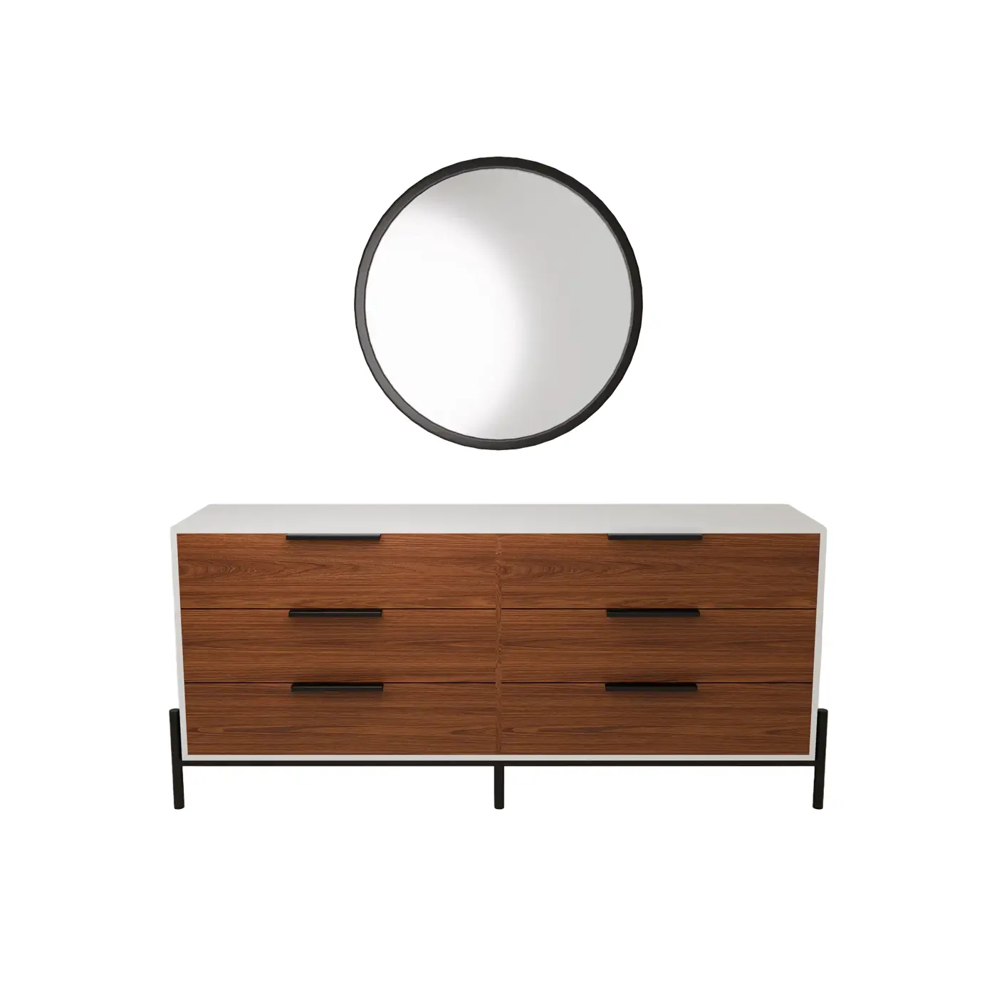 The Velador 6-Drawer Dresser by Asghar Furniture stands out with its rich wood finish framed by crisp white edges and slim black legs. Designed to bring warmth and contrast into modern bedrooms, it features six generously sized drawers that keep storage hidden and organized without visual clutter. Ideal for contemporary and modern interiors across the UAE, Velador delivers a bold yet balanced statement with long-lasting craftsmanship.