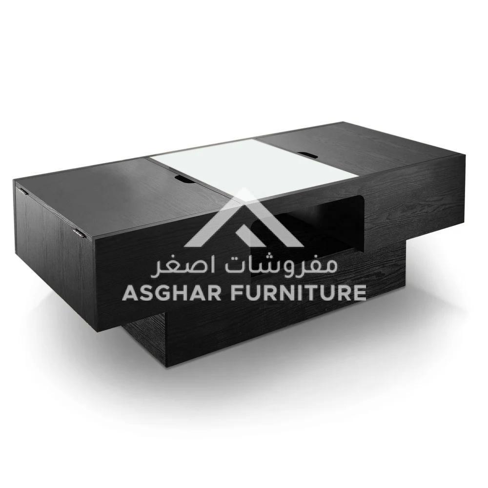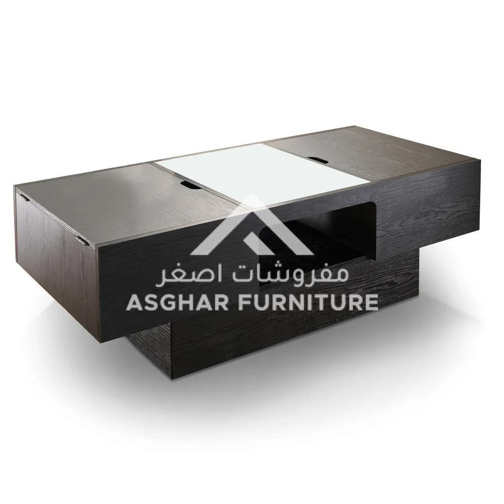 This contemporary coffee table by Asghar Furniture is constructed using wood with a glass top for an interesting and functional piece that offers two storage compartments and one open shelf under the glass for concealed storage. An extra shelf below the glass top adds another space to show off treasured decorative items.