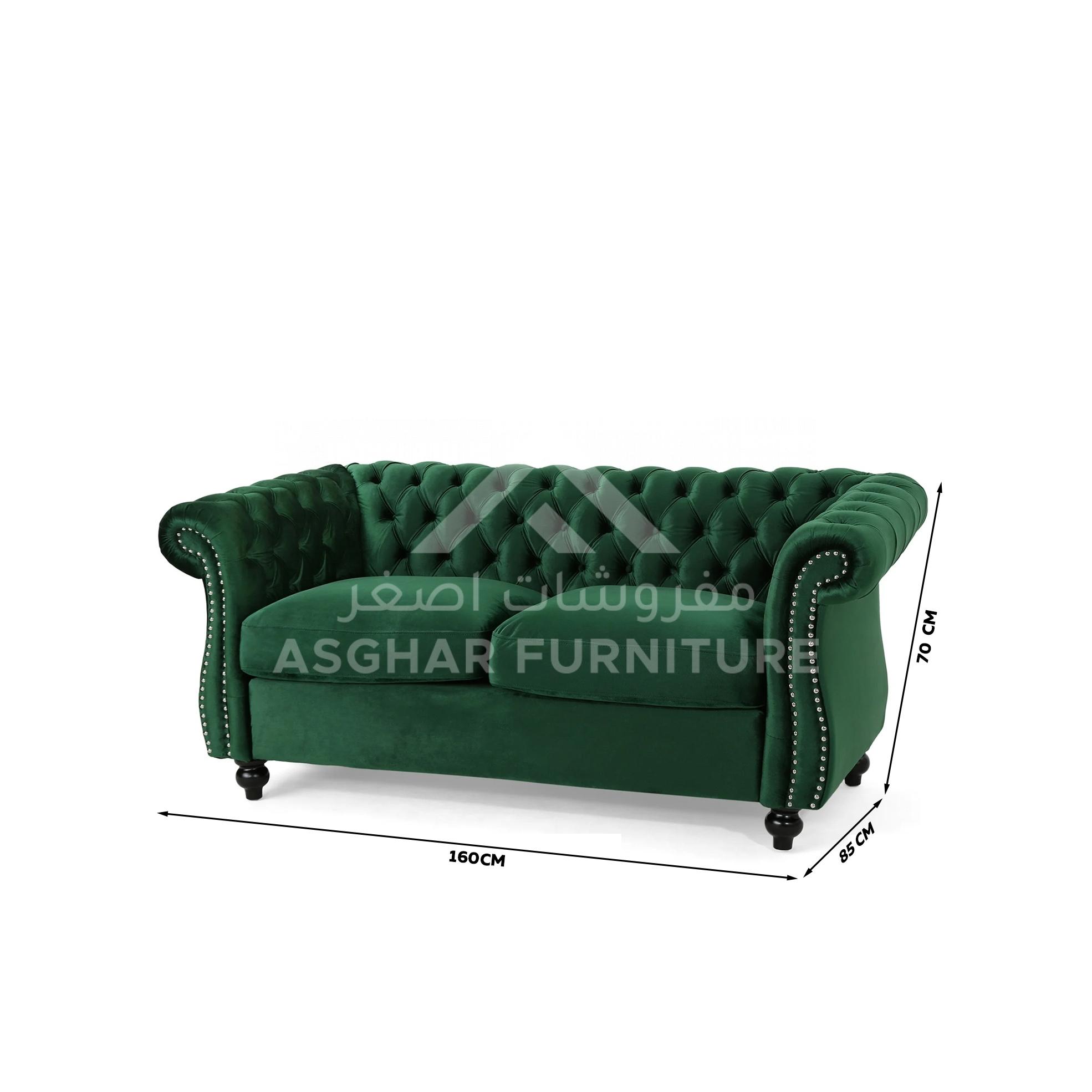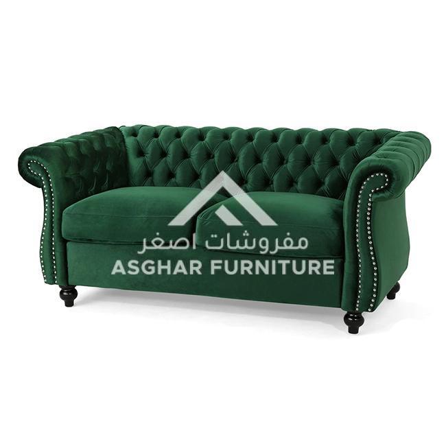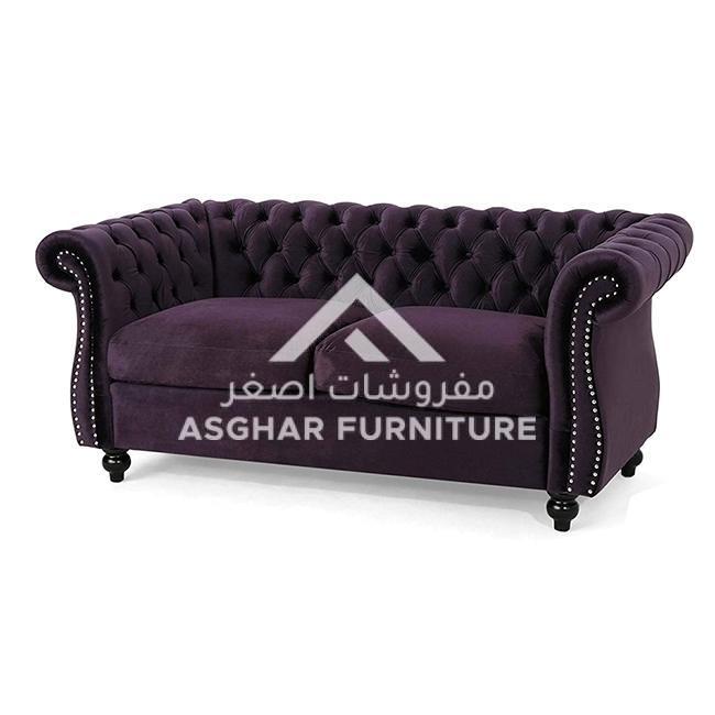 At Asghar Furniture, This Harley Flared Arm Loveseat, has a frame constructed of solid and manufactured wood, upholstered with 100% polyester, and filled with foam. It features flared arms, a tufted back, and nailhead trim.