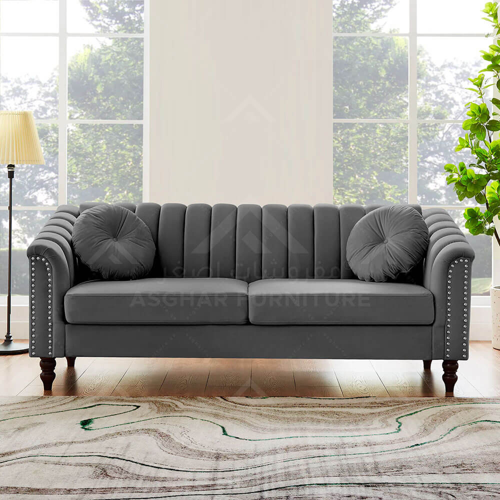 Beautifully styled and consciously crafted, this Flared channel tufted sofa is the ideal addition to change the whole flow of your living room or condo with its modern design. Nailhead trim puts the finishing touches on the unique straight arm with a sloping detail. Detachable seat cushions with skin-friendly velvet fabric keep your sofa feeling plush and comfortable.