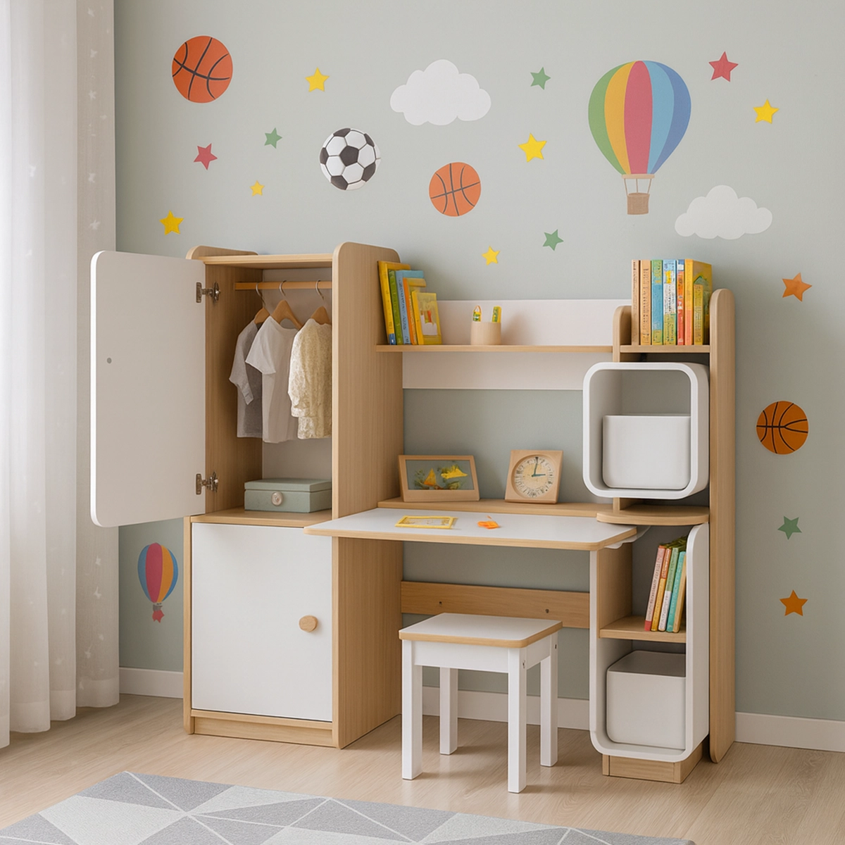 The KinderWard Study Unit combines a kids study desk, mini wardrobe, and storage shelves into one smart, space-saving workstation. Its warm wood-and-white design keeps books, clothing, and essentials organized, while the durable, child-safe build makes it an ideal study and storage solution for modern kid’s rooms.